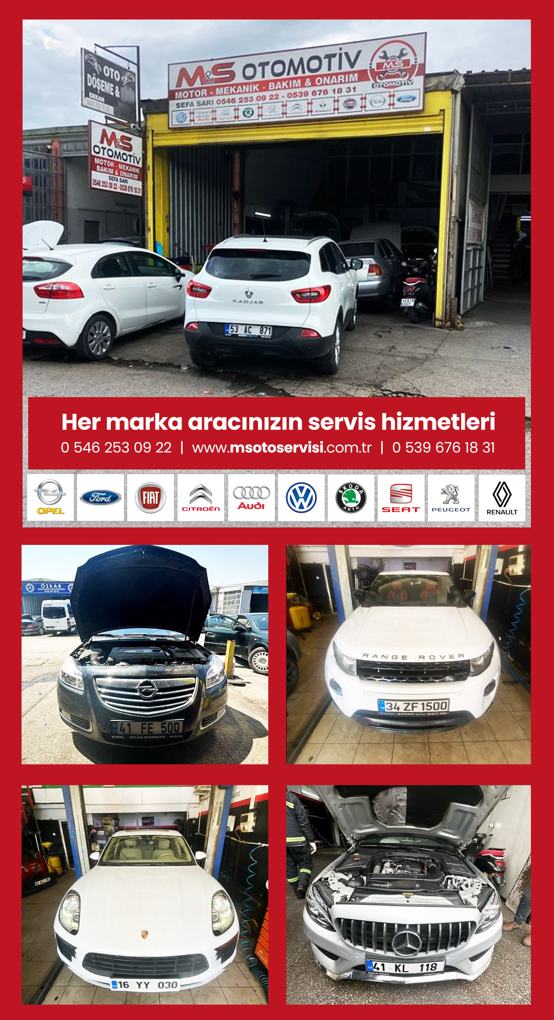 Kocaeli İzmit Sanayi Sitesi'nde bulunan servisimizde; VOLKSWAGEN AUDİ SEAT SKODA PEUGEOT CITROEN RENAULT FIAT FORD markalı araçların yanı sıra diğer marka araçlarında servisliğini yapmaktayız.